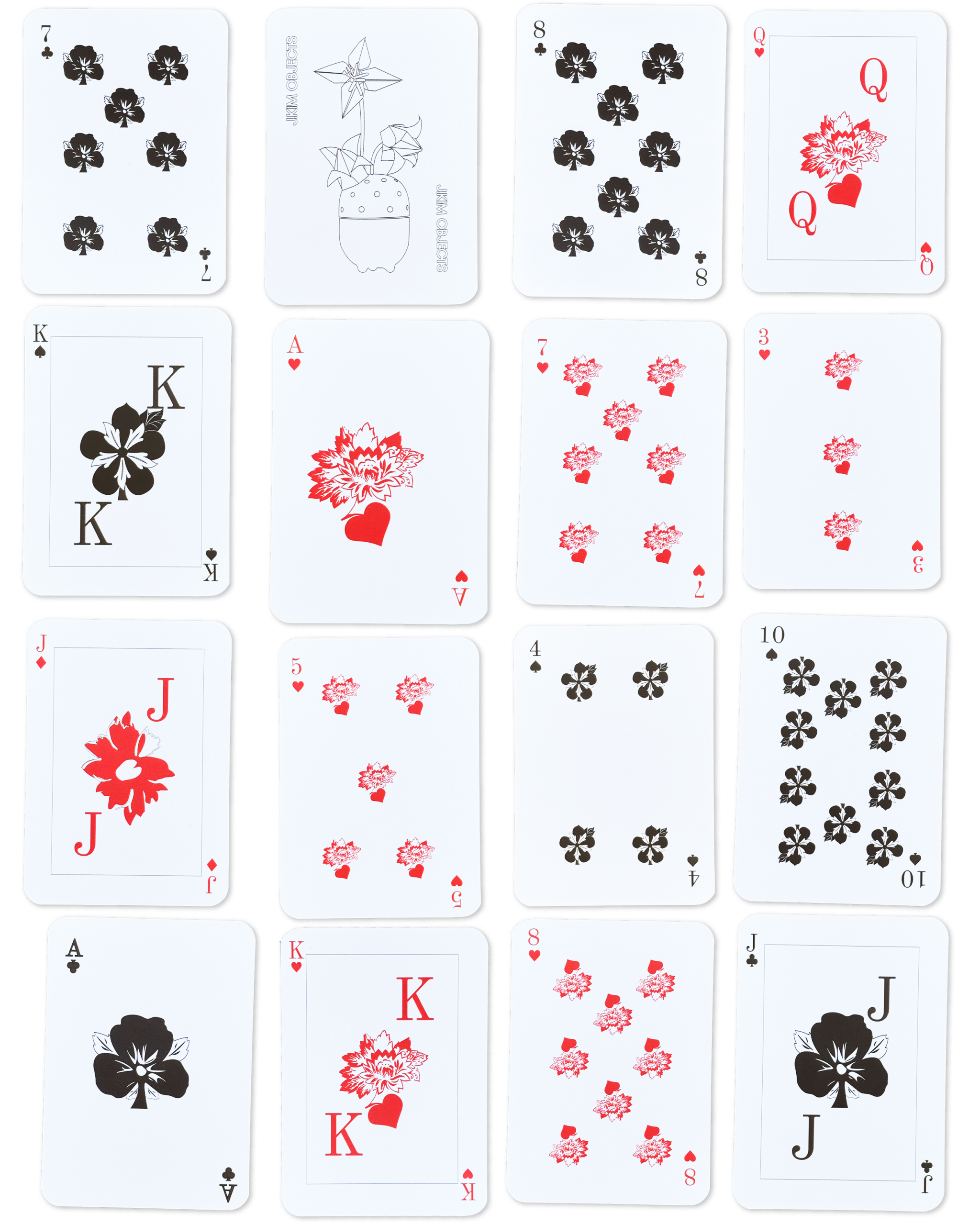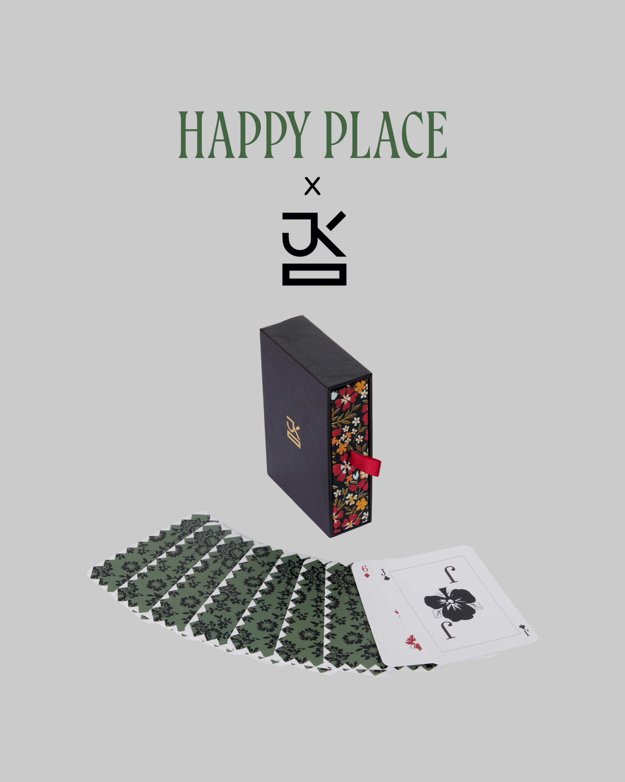 Игральные карты Quroq by J.Kim x Happy Place представлены в фактурной черной геометрической коробке с внутренним оформлением, вдохновленным винтажной тканью. Колода, состоящая из 53 карт, украшена мастями, вдохновленными цветочными принтами.