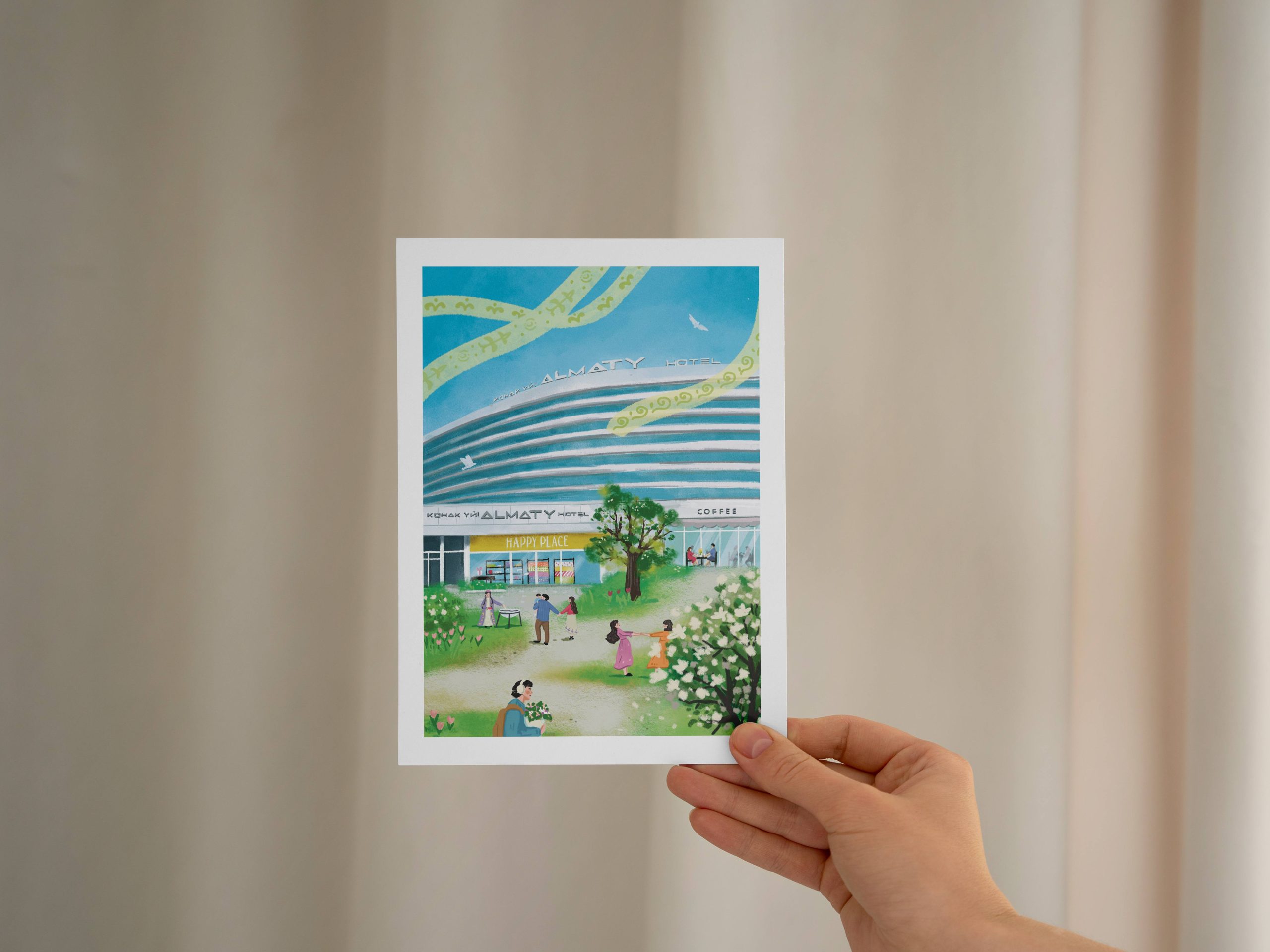 Открытка с весенней атмосферой у отеля «ALMATY». Воздух напоён теплом, капает капель, на ветках первые почки и цветы, а прохожие словно оживают после долгой зимы. Всё вокруг наполняется лёгкостью и предчувствием нового — наступила весна.