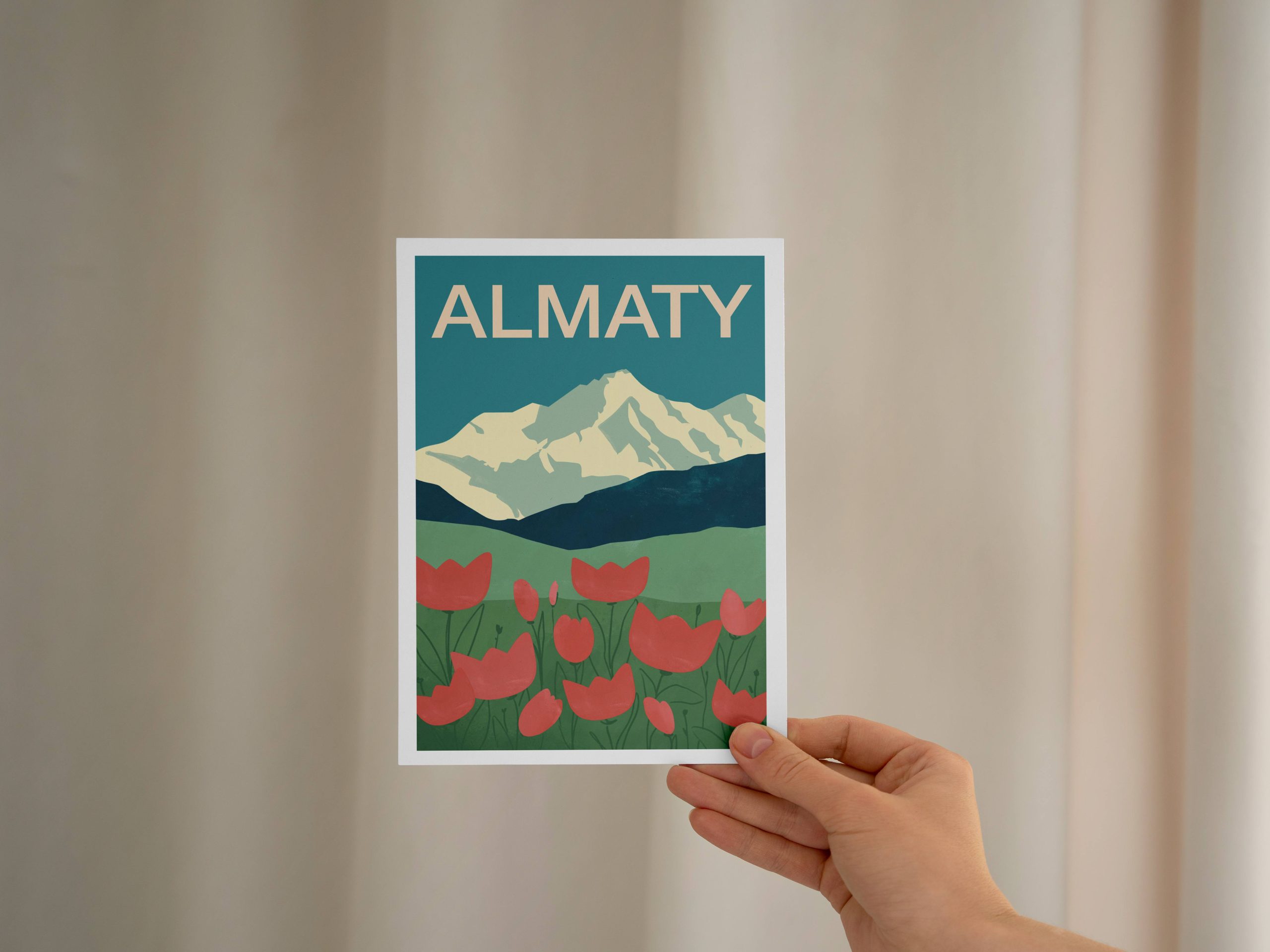 Открытка из серии, посвящённой Алматы, в духе лёгкой ностальгии и винтажной теплоты. Заснеженные горы вдали и поле красных маков на переднем плане.